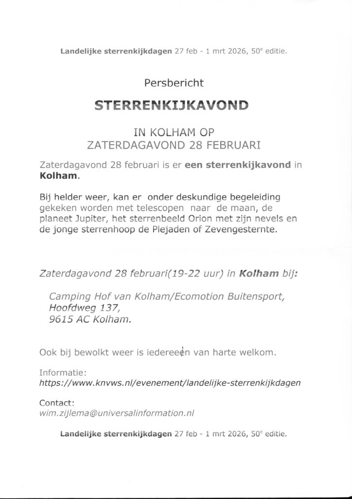 Op 28 februari organiseert Wim Zijlema een sterrenkijkkavond in Kolham bij Camping Hof van Kolham/Ecomotion Buitensport, Hoofdweg 137, 9615 AC.